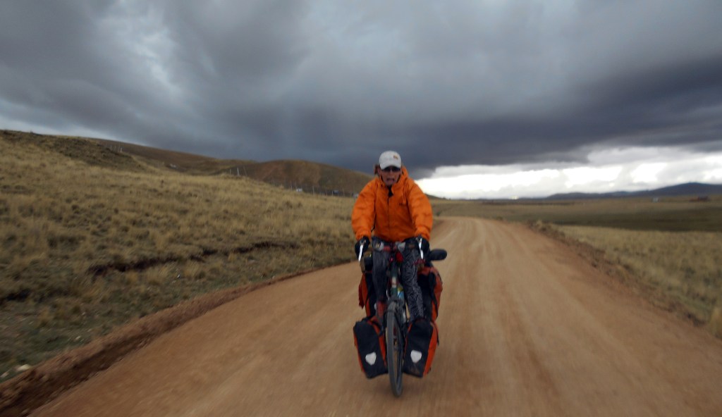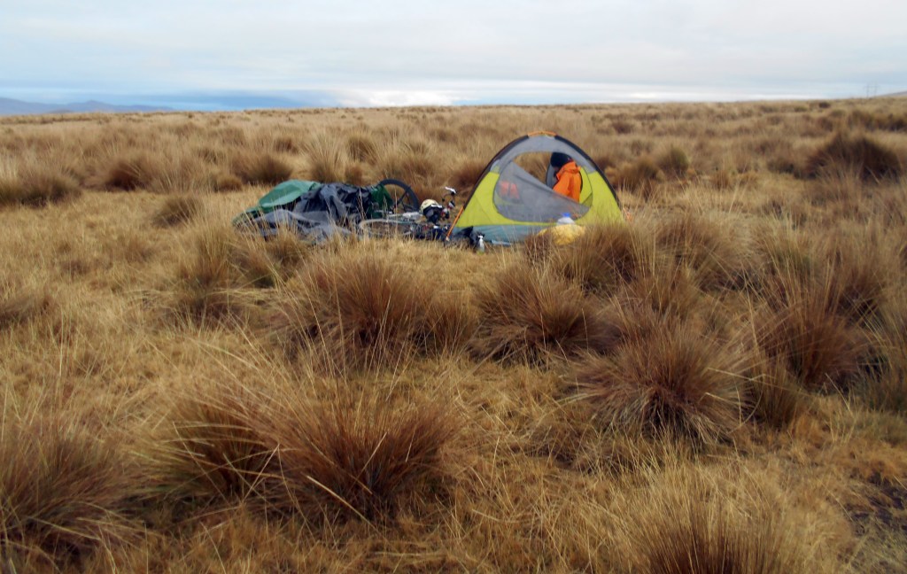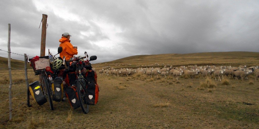 We decided to make camp when some dark clouds formed overhead in the late afternoon. We pushed our bikes through a field of sheep to do so. Before long these sheep were rounded up by a couple of friendly lads on a motorbike, along with a herd of llamas (I mean, the llamas were also being herded up, they weren’t also sitting on the motorbike). It really did feel great to be out in this remote location. The cycling now was a lot easier and I just thought it a shame young Max hadn’t continued his journey a little longer to see if he would have found this a more enjoyable experience. But he’d by now made up his mind that cycling around the world wasn’t for him, at least not at this time in his life, and was going to continue his travels in a different way. It was a bit of a shame things didn’t work out, but it did seem like the best thing for him.