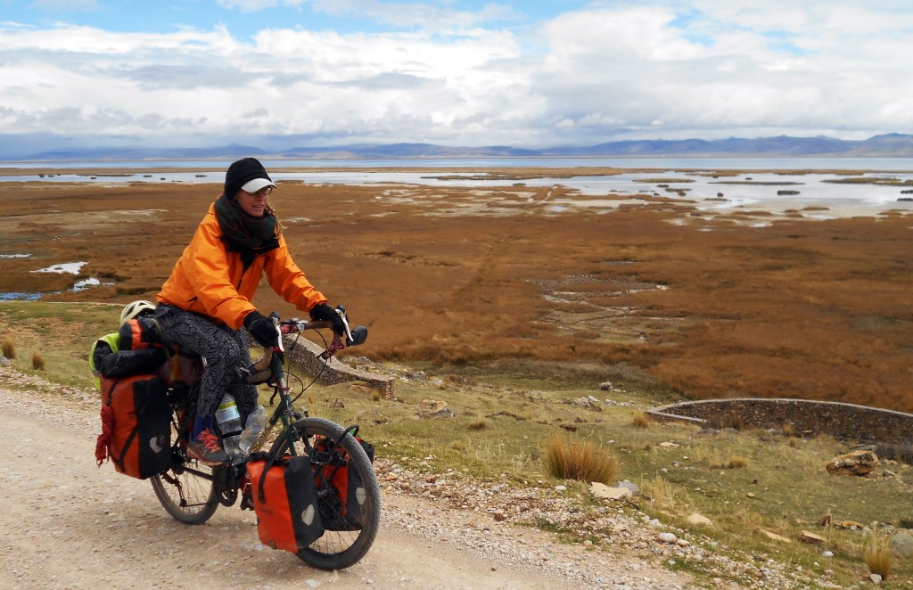 Initially the road was paved to a small town, after which we were worried about how bad it was going to get. But it was actually a very fine dirt road, with a compact surface that wasn’t a big problem for Dea’s wrist, especially as it was very flat now. We were riding on a plateau around a huge lake. “This is what I wanted,” Dea said, looking around at the flat plains, 4,000 metres above sea level, that we had all to ourselves. “I’m so happy!”
