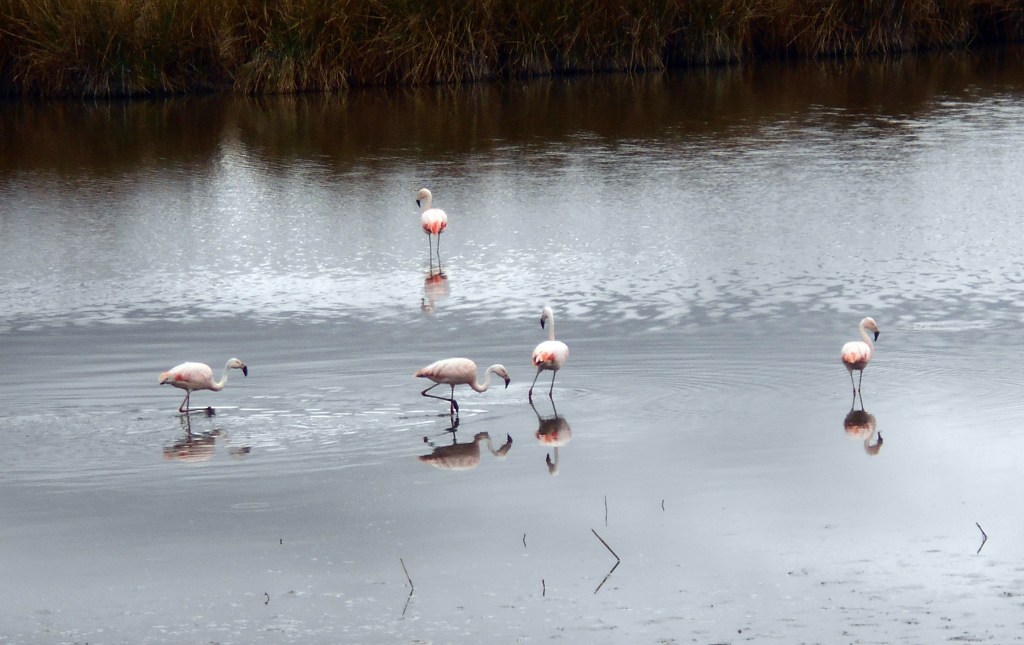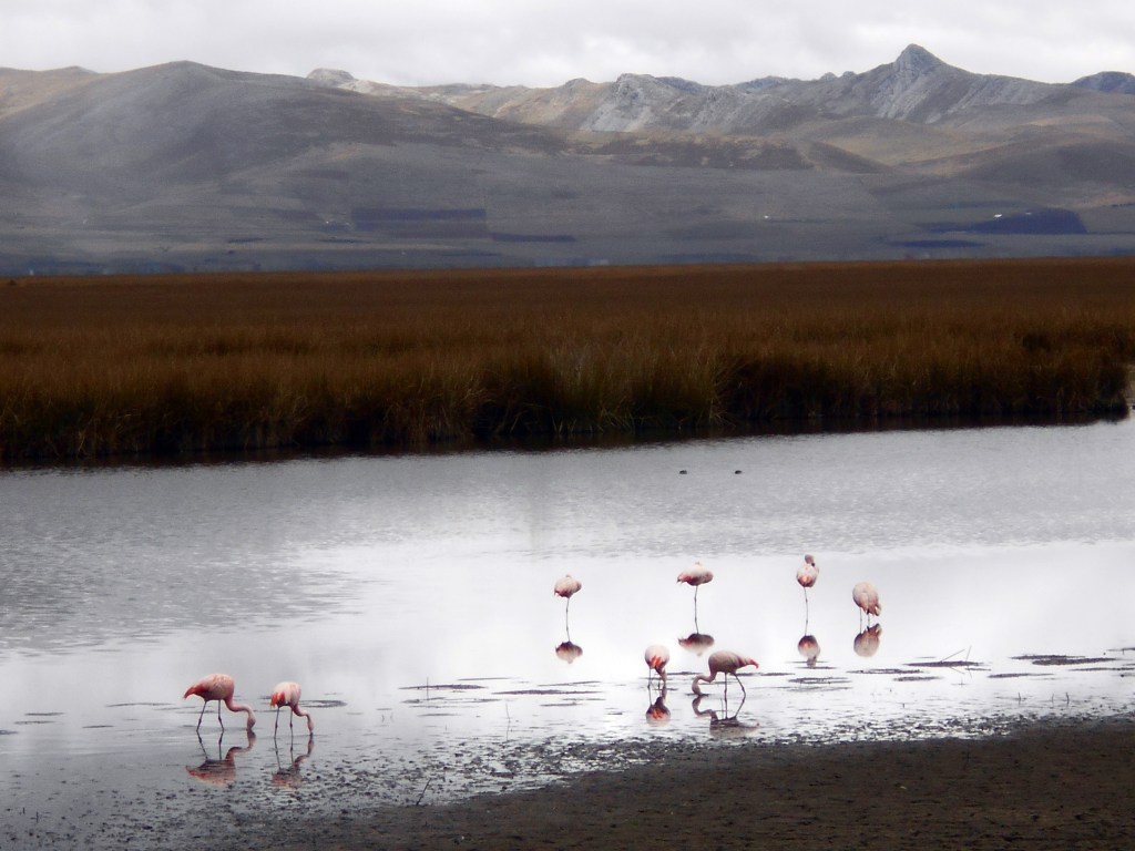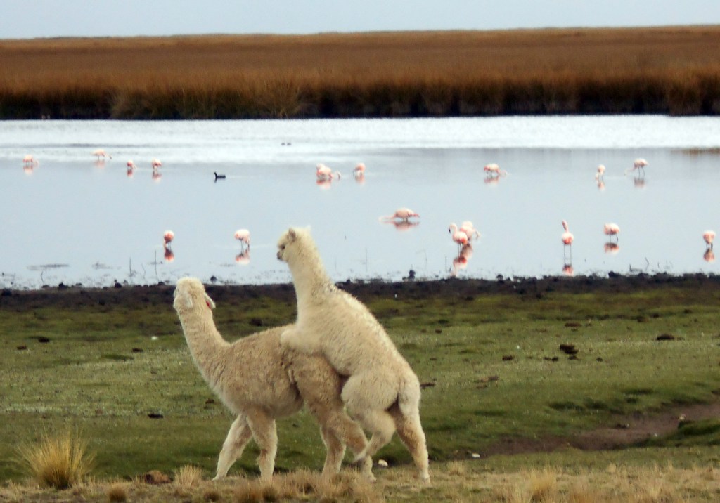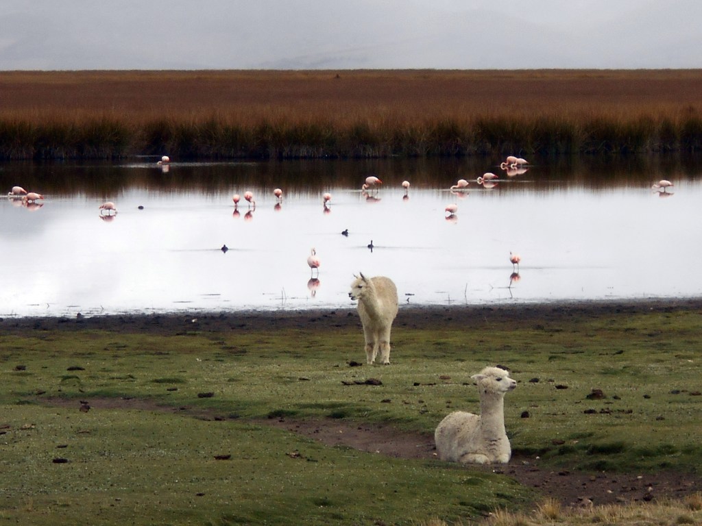 The next day Dea and I continued to follow the dirt road around the lake, and it continued to be extremely pleasant. The highlight was seeing flamingos out on the lake. There were big flocks of them, standing around, strutting around, occasionally flying around, and it was very cool to see such beautiful birds out in their natural environment. At one point we could see llamas on the land right next to the flamingos and as well as providing us with excellent photo opportunities it was a very cool reminder of what a great place we were in.