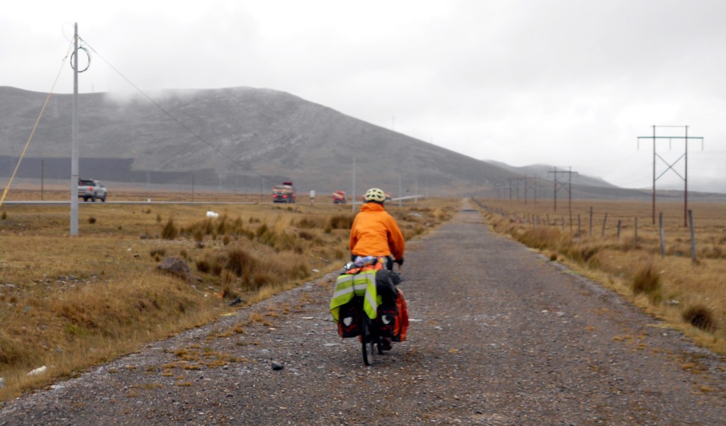 We’d made camp at 3,800 metres and were up early to climb the rest of the way to the top of the next pass at 4,400. It was a nice, gentle climb on a road with a good shoulder, until the road got busier past the main turn for Cerro de Pasco, when the shoulder shrank. We survived it to the top of the pass where we were greeted by some waiting llamas, then descended a little. By this point the shoulder had narrowed still further and Dea confessed that she was scared by the traffic. The idea of switching to a dirt road came up, but Dea was nervous of risking her wrist on the bumpier surface. But when the shoulder shrank to nothing, the risk-of-a-bad-wrist versus risk-of-death balance had shifted, and we decided to get off and give it a go.