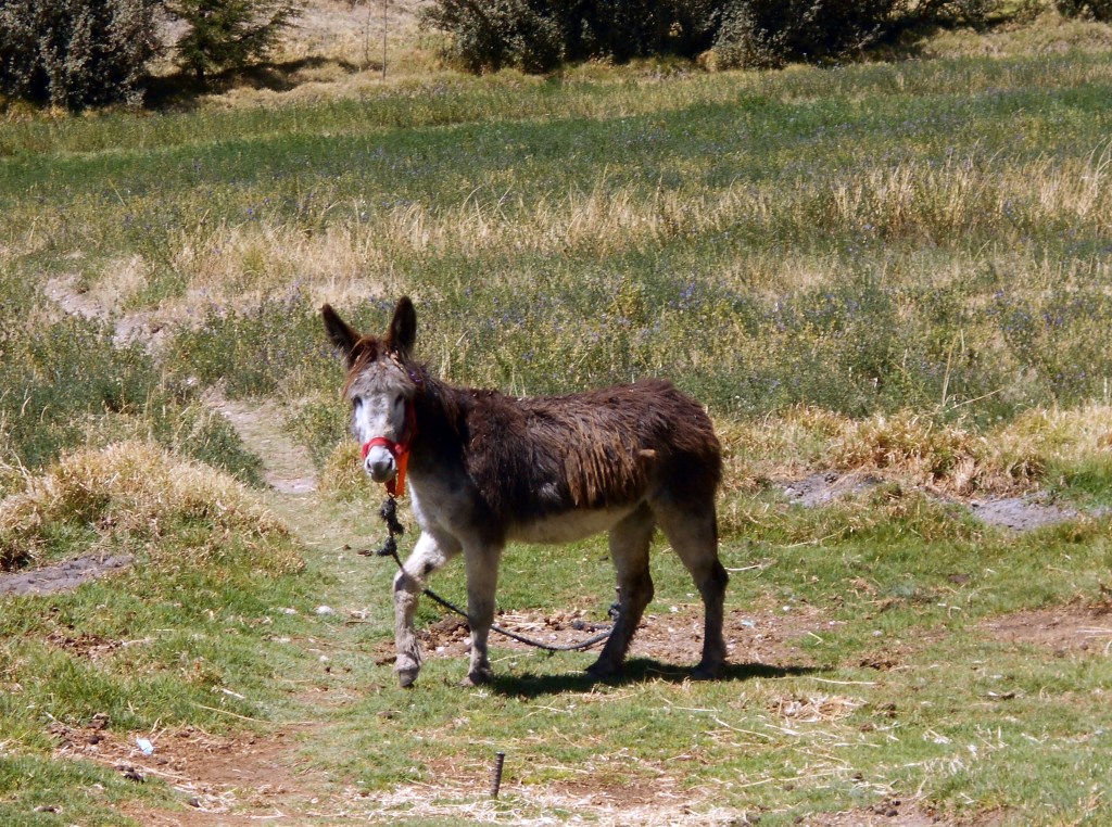 Eventually we struggled our way up to a tiny village, mostly populated by donkeys, at which point we could join a gravel road and get back upon our bicycles. That led us east to Jauja, where we rejoined the highway. It now had a shoulder and we made fast progress across a flat plain, taking the chance to ride on parallel side roads through villages whenever we could. This led us to the edge of Huancayo, where we took a cheap hotel outside of the big city. The next day we took a rest from the bikes, and I walked into the city centre to get supplies at some supermarkets, a walk which confirmed to me that we’d made the right decision in not trying to cycle in. It wasn’t a very nice place and the roads looked busy and dangerous. And we had a perfectly nice hotel, with an excellent pizza restaurant nearby where we ate two nights in a row. Pizza was a good meal for me, as I still had some nasty sores on my lip, I assumed from the sun, that were simply not healing, and it was easier to eat without a fork (that was my reasoning anyway).