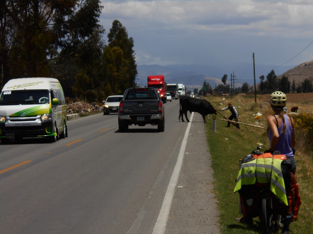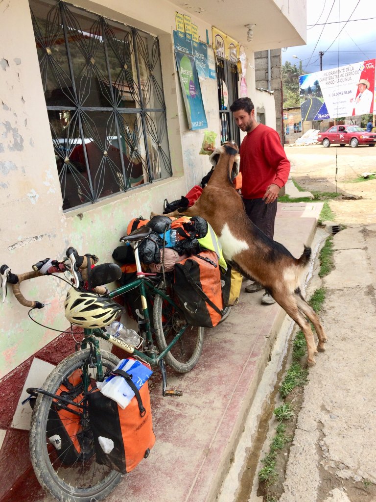 The road I had planned to take from Cerro de Pasco to meet with Dea was indeed closed, but fortunately there was another one running parallel to it. It was an easy downhill through a gorge that led me out to the main road that Dea had been ascending for the past few days, and it was wonderful to see her again, waiting patiently for me at the side of the road. We celebrated our reunion with lunch in a nearby restaurant. As we took our seats and began catching up, we could see through the open door a stray goat wander over to our bikes and start sniffing them. It seemed harmless enough, until it got a packet of cookies out of my basket and started dragging them away. Not one to give up my cookies easily, I ran outside to scare the cheeky goat away, but it wasn’t the least bit scared of me. It kept coming back to the bikes and jumping up on them, like it fancied having a go at biking around the world itself. Sorry buddy, but applications for The Apprentice are closed.