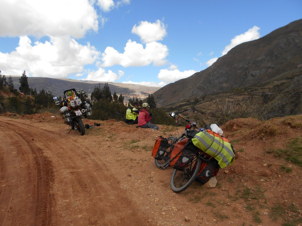The following day our decision not to ride into Huancayo was further vindicated as we were able to cycle around it on a lovely, quiet bypass instead. From there we completed another long climb, and began on another long descent. We were riding on another highway, but this one was pretty quiet. One of the vehicles that passed us was a motorcycle with panniers. I saw it in my mirror slow down so that the rider could offer Dea a high-five, before he came up to me and pulled to a stop. I noted the bike had Ohio plates, but the rider just looked at me dumbfounded for a moment from behind his helmet as if unsure of what to say. He then blurted out a muffled “Ola!” before gunning the engine and heading off down the road.