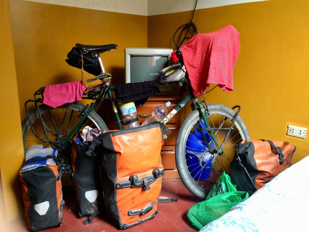 The next day I had planned a longer ride of 45 kilometres and 1,100 metres of ascending up to the next town with a hotel. I was up and out at 7am, just eager to cycle. The road consistently followed a winding river that cut through the mountains, and the traffic was light, but I stopped completely whenever I heard or saw a truck coming up behind me to let it pass safely on the narrow road. I didn’t want anything to go wrong now and I had all day. The only thing that really disturbed me were the dogs, and unfortunately there were many of them on this stretch of road and they all seemed extremely mad at me. They would bark loudly and sprint towards me, growling with their teeth out, and they scared me a lot. I found myself most confident in stopping to face them with shouts and rocks (which to their luck I was extremely bad at hitting them with), instead of encouraging them to chase me while I tried cycling away from them, which I wasn’t able to anyway. It worked most of the day, only one dog actually snapped at my panniers, but I was shaken and had a sore throat as I reached Huariaca, the town of that day. It was just before the big afternoon rain pour and I found shelter first in a restaurant and then in a nice little hotel. Here I spent the rest of the afternoon reading and hiding from the intensity of the world.