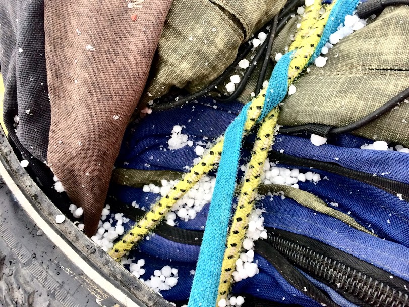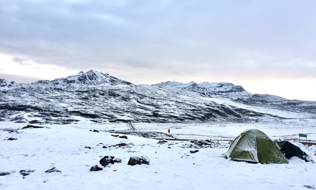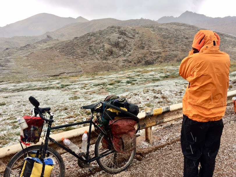 The descent was a less enjoyable affair. The weather took a turn for the worse, and we began to be pummelled by hailstones that were the size of golf balls, if you can imagine someone for some reason playing golf with tic-tacs. We had nowhere to hide and chose to keep riding, but we soon became cold and wet, and so we stopped and got out the plastic sheeting we’d until recently been using as a makeshift tent flysheet, and we made a temporary shelter to hide under, shivering. After a while the weather improved and we were able to ride on, but the delay meant that we weren’t able to get down as low as we wanted before it was time to set up camp. We had to do so at around 4,500 metres, the highest night of our lives. Not long after we got the tent up, it began to snow.