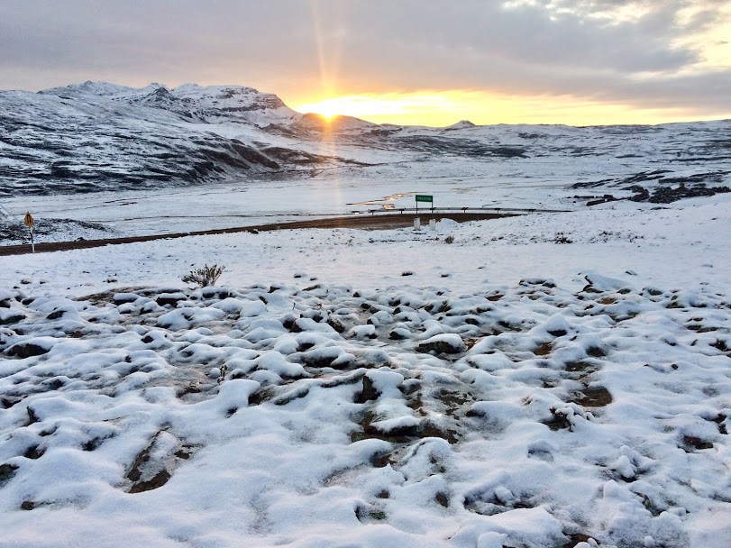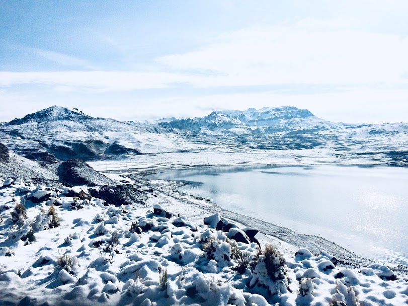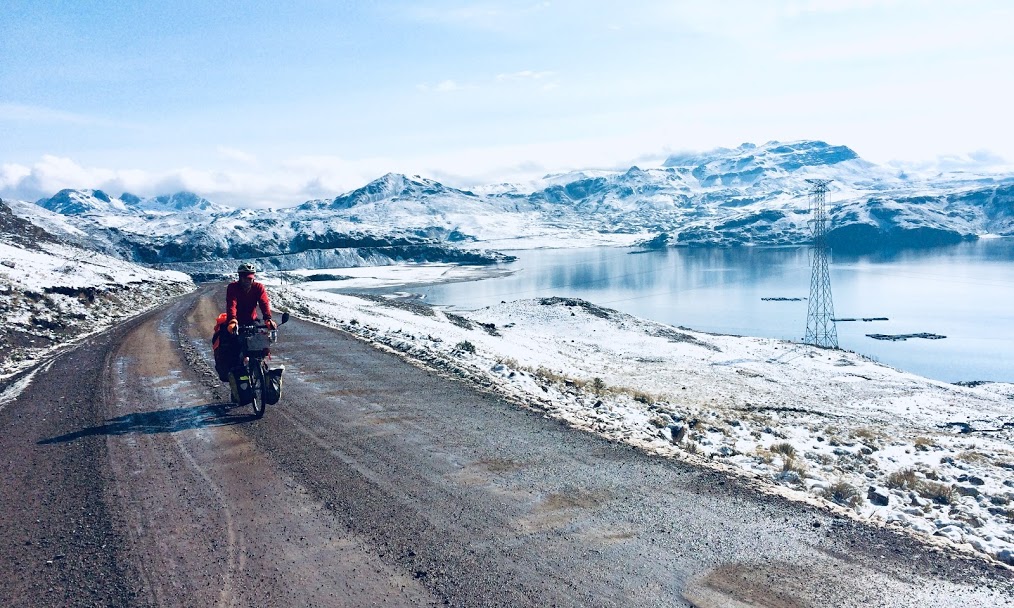 We awoke to a beautiful winter scene, with snow all over the mountain peaks around us. It was an inch thick on the ground around us too, but fortunately the road wasn’t too bad and we were still able to cycle. The sun soon came up to warm us, and altogether it made for a beautiful morning ride. We soon came to some high altitude lakes, where we were a little surprised to see flamingoes in the shallows.