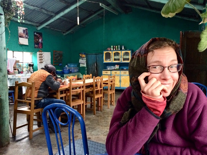 Long climbs and long descents were becoming our routine now, and the next day we found ourselves winding up a series of elaborate switchbacks through even more colourful mountains of bare orange and yellow rocks. There were no trees and nowhere to hide if the thunder and lightning that seemed to always be nearby should hit us. We got to the top around midday, and at over 4,700 metres it was the highest either of us had been since the day before yesterday. It was the wet season in Peru, but so far that seemed to mean rain would come in the evenings, but today the storm caught up to us early and it began to rain and hail on us just as we began our descent. We rolled down into this awful weather. I found it exhilarating to ride through the storm, thunder crashing around us, shapes of mountains through the gloom that grew more snowy with each moment, but it was extremely tough also. Our hands and feet soon froze with the cold and the wet. Water was splashing up off the road onto our feet and this was especially tough on Dea, who had only running shoes for protection. She was soon in agony, as her feet felt like they would freeze off. We stopped and I tried my best to help, warming her feet with my breath and wrapping them in plastic bags to keep them warm and dry as best we could. We continued on down, praying desperately for a restaurant or somewhere we could escape to dry off. After what felt like an eternity we descended down into a narrow valley where a village appeared, and finally a restaurant. We got ourselves inside, dripping wet and looking miserable. I would go so far as to say we looked like drowned rats, if rats were almost six feet tall, wore clothes, and looked like humans.