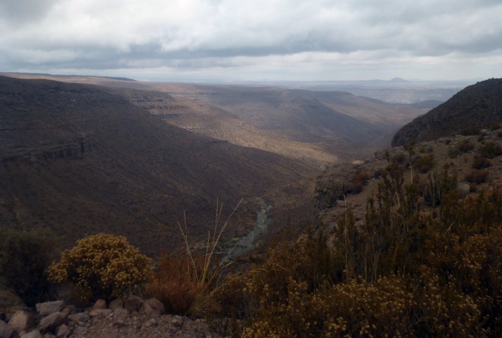 The descent was as amazing as we’d hoped. 3,200 metres of altitude in all, first through a fairly narrow canyon but then opening up into the most extraordinary vast landscape as the mountains fell away behind us. We glided down on the smooth asphalt road, its perfect surface making the free ride even more glorious. To our left the land fell away into a canyon of such spectacular dimensions that it brought memories of the Grand Canyon to mind, to the right was a similar gouge in the Earth, and we rode down upon a descending ridge between these two chasms. It was a truly breathtaking ride. We passed briefly through an area of cactuses and I hoped that the Atacama ahead of us was going to be as interesting a desert as Baja California had been, but as we lost altitude the cactuses stopped, and indeed so did practically all other vegetation. The landscape was bare, coloured only by various shades of brown and grey, and yet, still, it was truly awesome. We could see inconceivable distances down across the desert. Far below us the land finally flattened out into the true Atacama, a pancake flat, nearly featureless land. Beyond that a mountain range of shimmering blue was the only thing that stopped us seeing all the way to the Pacific Ocean. We descended for hours. It was such a long way down that we didn’t even complete it all in one day, stopping when we found a little shelter to hide from the desert winds.