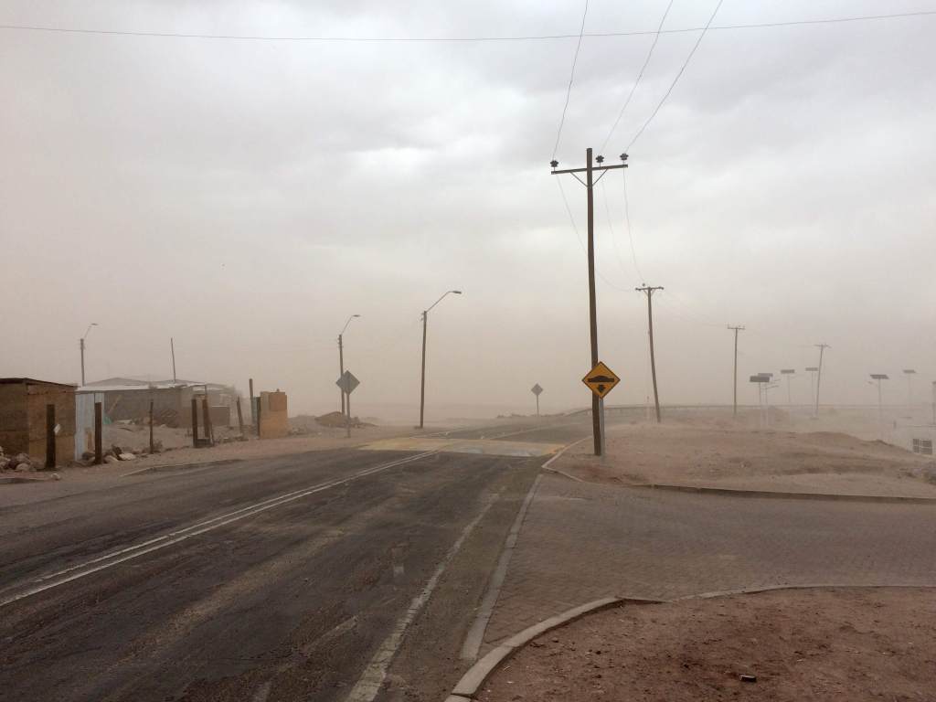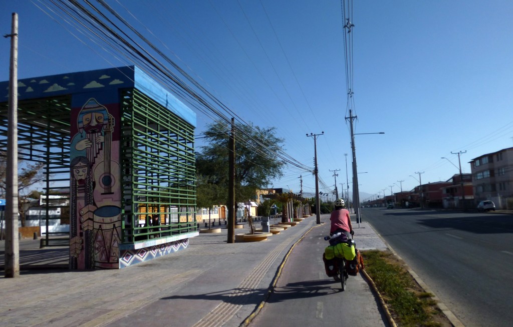 The next morning we completed our descent and reached the flat desert, the true Atacama. We’d been able to see the towns of Huara and Pozo Almonte from more than forty kilometres away, and gradually we made our way to them. First came Huara, a small town where we stopped to eat our lunch in a park. The streets, arranged in a grid pattern, were eerily reminiscent of the United States. It really was strange, and we agreed that the small park we sat in felt just like we were back in Arizona, sprinklers keeping the grass unnaturally green in the desert. But Pozo Almonte was even more strange. It was another 32 kilometres to get there, ridden on the main highway south, a much busier road than we were used to but with a good shoulder. It was fine until the winds picked up in the afternoon and blew us about a bit. We were therefore relieved to get to Pozo Almonte, but it was sure a strange town. The American influence was also overwhelming here too, but it also felt like it was from a different time, with a real wild west flavour to its covered sidewalks and dusty sidestreets. It was still Latin America but very different from anywhere else we’d been in Latin America. Chile was undoubtedly more developed than many of its neighbours in South America, and yet at the same time there was clearly a lot of struggling people here too. It wasn’t really the kind of place we liked, but we still stopped for a couple of rest days in order to prepare ourselves physically and mentally for the long stretch of empty desert we had ahead of us.