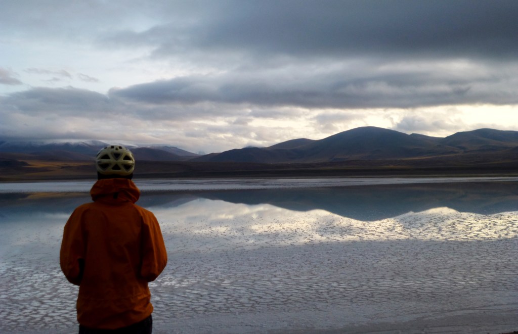 We were awake before four and on the road not much later, cycling by our headlights. The wind and rain was gone and it was nice to be out adventuring at such an hour. By the time the sun rose we had made it up to a bit of a plateau, and the dawn light revealed the most spectacular snowy peaks all around us. It was so beautiful and we both felt great to be riding in such a special place. As we’d hoped the weather was great and we soon came to some stunning salt lakes. It was a fantastic road, a great place to cycle, and we were both so glad we were doing it together.